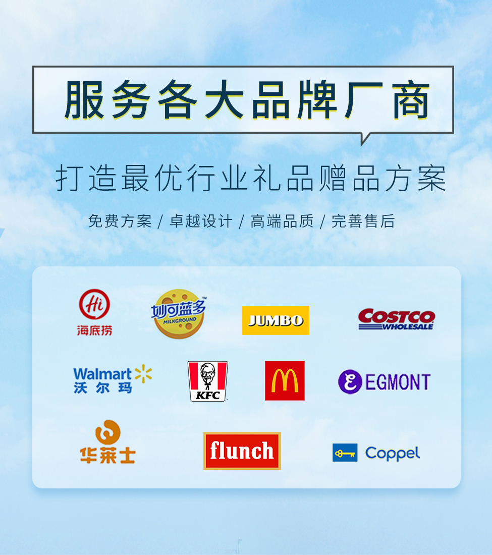 我们以塑胶制品为主营产业,做各行业的产品的定制赠品服务。我们始终以客户需求为导向,以优秀的创意策划、工业设计、供应链服务为核心竞争力,为客户提供全面、及时、专业的营销礼赠品解决方案。公司长期深耕礼赠品行业,且长期作为海底捞、飞鹤、walmart等国内外知名企业的核心供应商,积累了丰厚的礼赠品创意设计、研发、供应链管理、大客户服务等行业优势能力与运作经验,充分具备行业领先企业的竞争优势。 在面向企业客户的产品促销、活动促销、积分兑换、员工福利、用户拉新、商务馈赠等礼赠品需求场景,通过营销方案策划、产品创意设计、供应链管理、仓储物流配送,以及数字化促销管理运营等一站式服务,为客户提供全面的营销礼赠品解决方案,帮助客户降低成本提高效能。 目前···